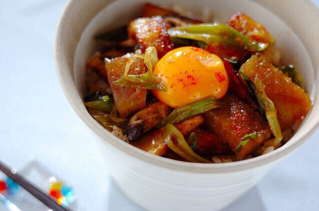 がっつり丼ものを食べたいけど、カロリーが気になるという人におすすめなのが、高野豆腐を使った豚角煮丼です。高野豆腐に薄切り肉を巻くことで、カロリーを抑えつつ、食べ応えがアップします。