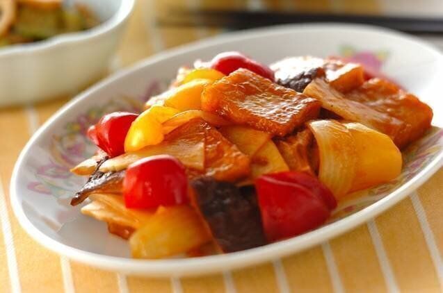 高野豆腐を酢豚風にアレンジしたレシピ。ニンニクとしょうがの効いた下味をよくもみ込んでいるので、がっつり食べたいときにも満足感があります。干ししいたけのもどし汁も、残さず使うのがおいしくつくるコツです。