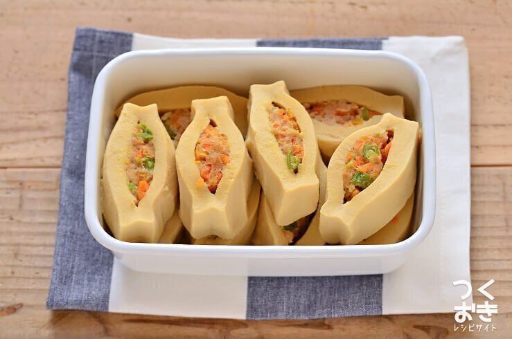 切り込みを入れた高野豆腐に肉だねを詰めた、ボリューム満点のおかずレシピです。たねを無理に詰めすぎないことが、見た目よく仕上げるコツ。食べやすいので、お弁当のおかずにも◎。