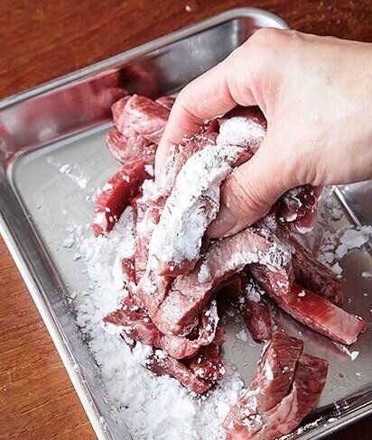 べんとうに炒めものを入れるときは、肉に片栗粉をまぶすと、とろみがつき、汁けが出にくくなる。