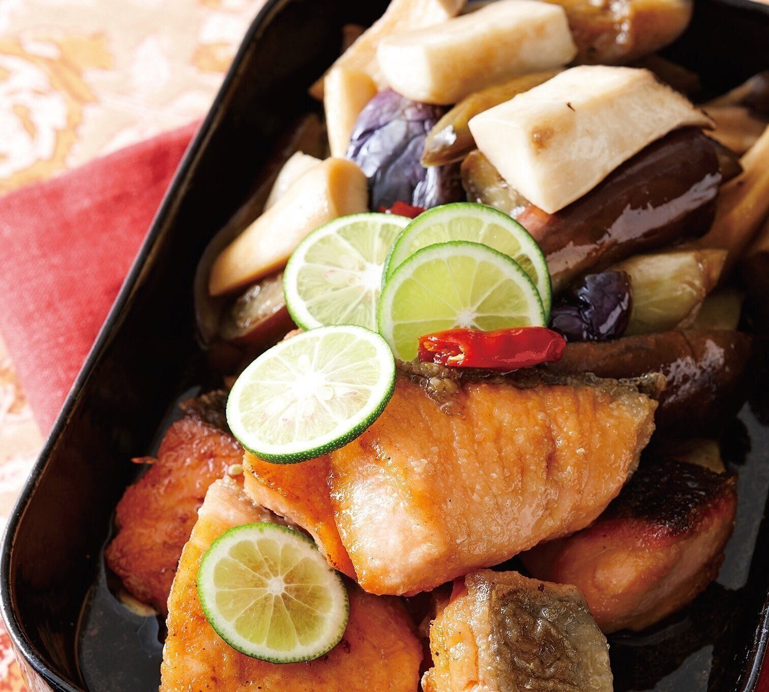 『サンキュ!』2020年10月号の「別冊:べんとうにもつかえるおかず」より鮭となすときのこの焼き漬けをご紹介します。