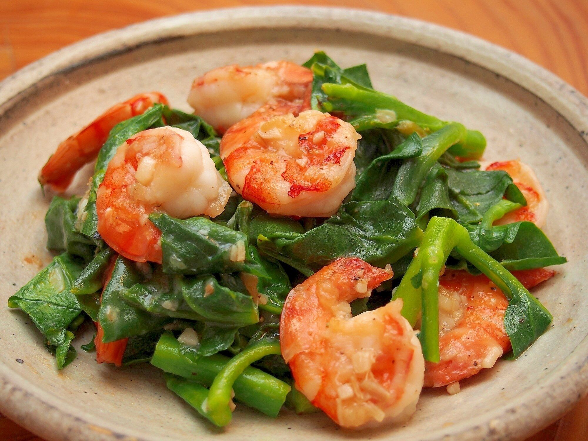 ツルムラサキの緑とエビの赤い色が鮮やかな炒め物のレシピ。シンプルな味つけですが、ニンニクとショウガがきいていてお酒のおつまみとしてもおすすめの一品です。仕上げにレモン汁をかけてさっぱり食べましょう!