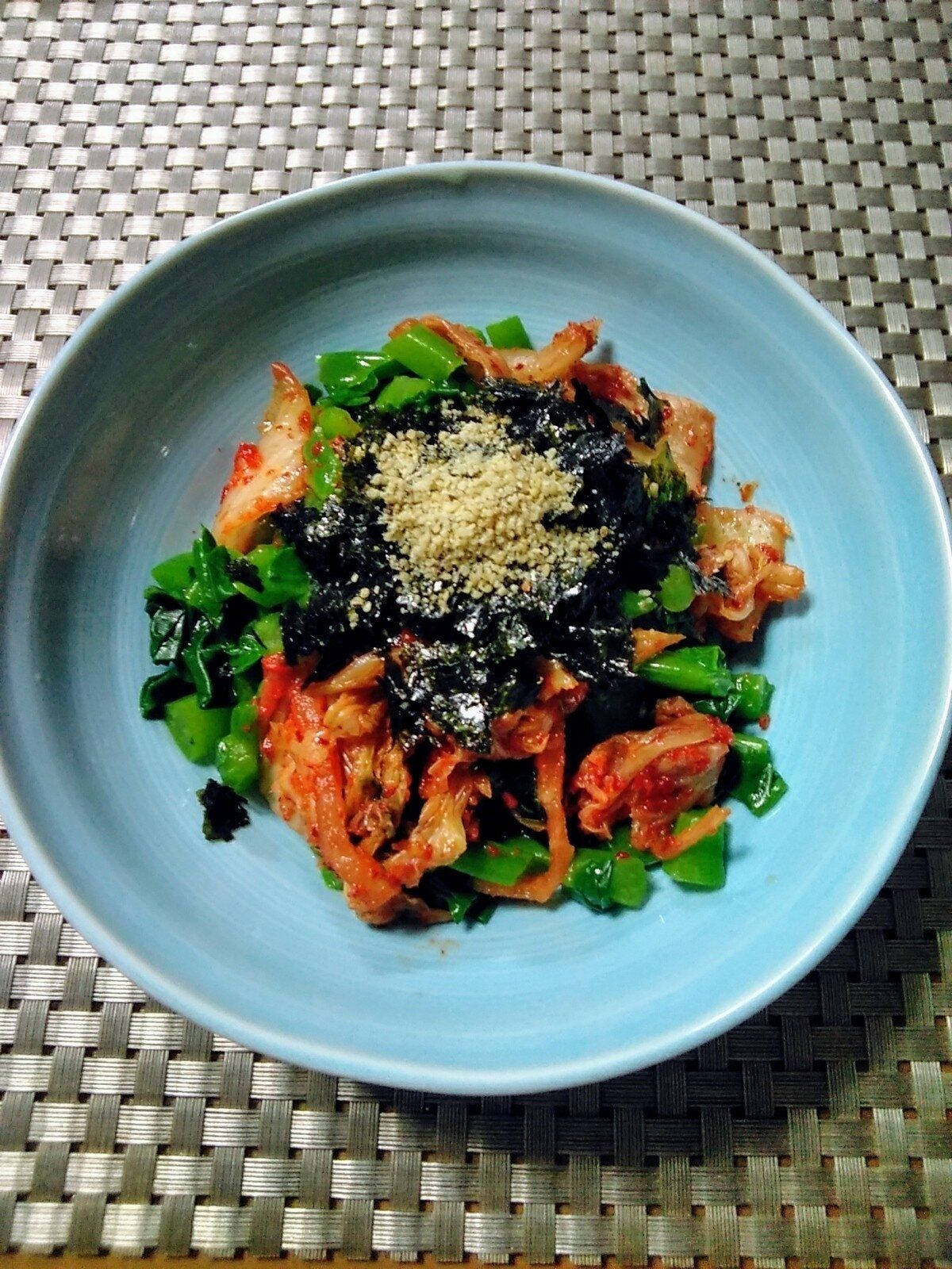 約10分でつくれる韓国風の和え物。ツルムラサキの青臭さもキムチやごま油、韓国海苔の風味により気にならず、食べやすく仕上がります。しっかり味がついているのでご飯もすすみそうですね。