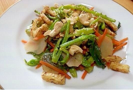 ツルムラサキを使ったたっぷり野菜の炒め物。香ばしく焼いた油揚げと、粗めに砕いたカシューナッツの歯ごたえがクセになる品です。ツルムラサキはサッと軽く炒めて、歯ざわりを残しましょう。