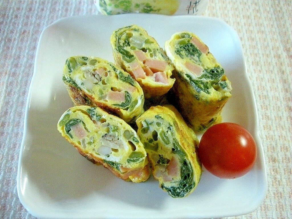 ゆでたツルムラサキとウインナーが入った中華風の卵焼き。具だくさんで満足のお弁当おかずです。卵の黄色、ツルムラサキの緑、ウインナーのピンクと、彩りもキレイで子ども喜びそうですね。
