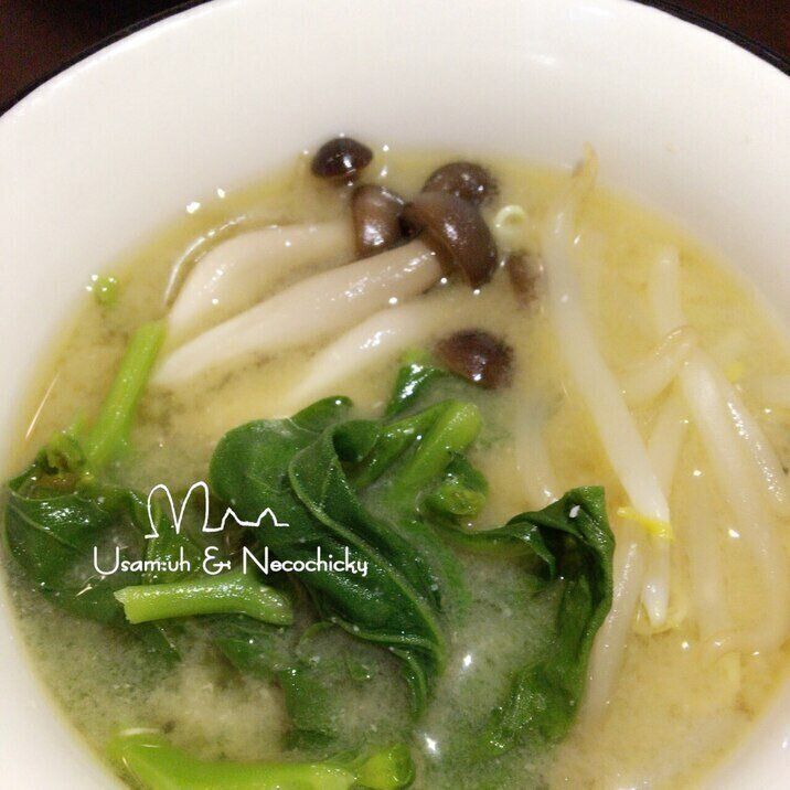 ツルムラサキ・もやし・しめじをたっぷり入れたみそ汁。栄養がしっかりとれそうですね。ツルムラサキは火を止める直前に入れましょう。煮すぎると、色が黒くなってしまいます。