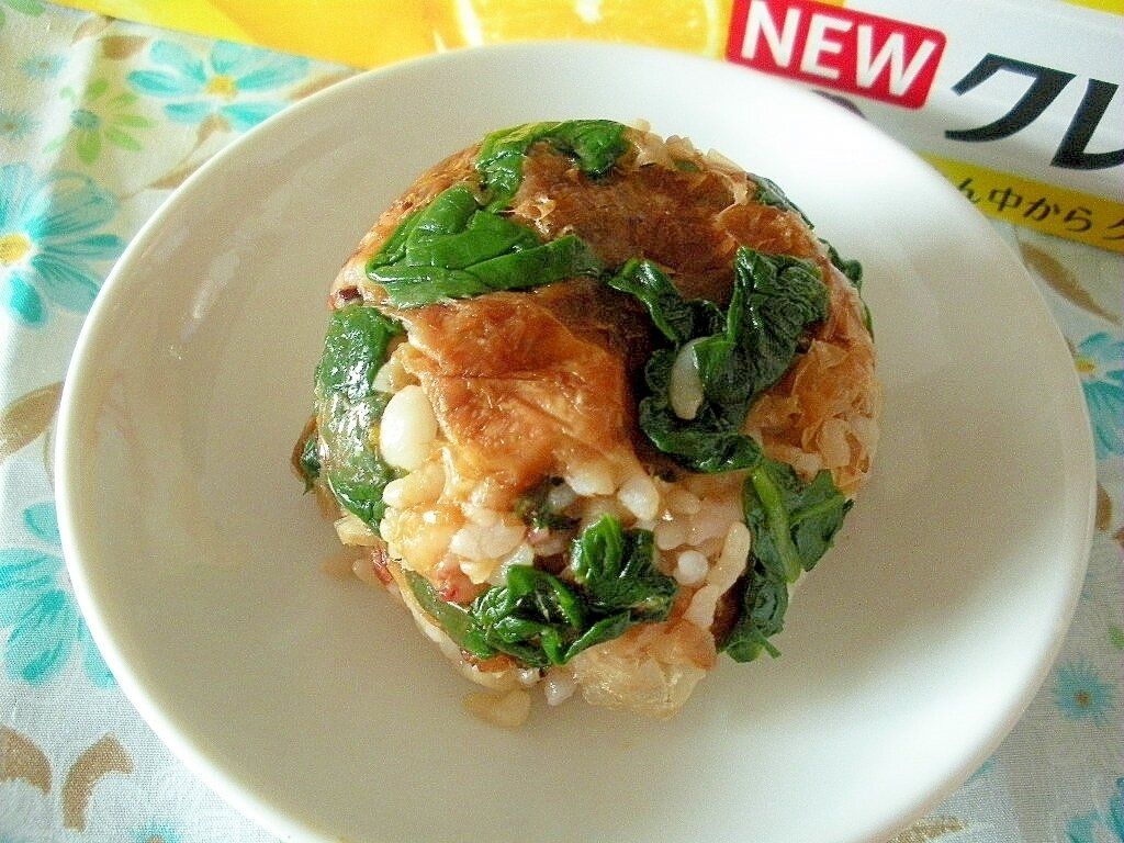 ツルムラサキのお浸しを活用した一品。かつおぶしと合わせたしょうゆ味のおにぎりです。お浸しをおにぎりにする場合は、しっかりと水気をしぼってからにぎるようにしましょう。