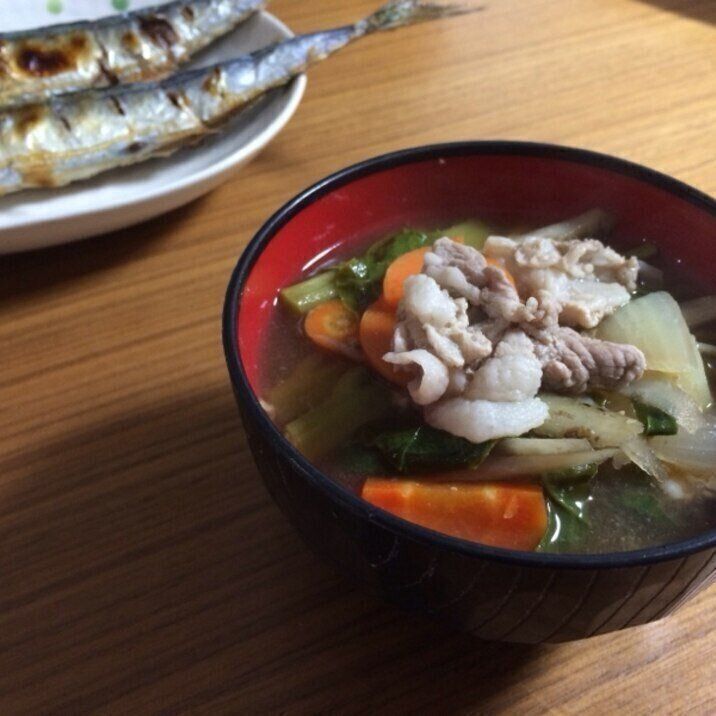 ツルムラサキは豚汁の具材にしても◎。にんじんとツルムラサキの色味がコントラストを生み、彩りもばっちりです。ツルムラサキは、最後に鍋に入れてさっと煮ればOKですよ。