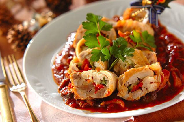 鶏肉でパプリカやチーズを巻いた、トマト煮のレシピ。彩りもあり、食卓が華やかになりますね。ボリュームとインパクトがあるので、パーティーメニューのメインとしてもおすすめです。