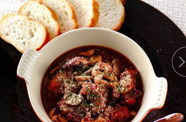 圧力鍋を使えば煮込む時間は5分でOKの、ポークビーンズのレシピ。具沢山で、この一皿だけで肉、野菜をたっぷり摂ることができますよ。トマトの酸味とミックスビーンズの旨みがよく合います。ご飯にも合いますが、バゲットに合わせるのがオススメです。