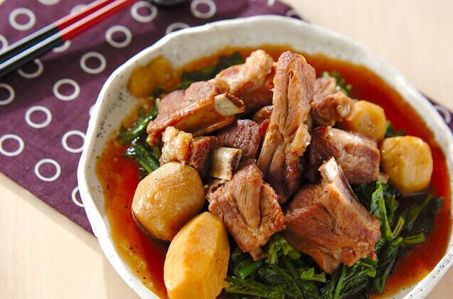 骨付き豚バラ肉や赤目芋などを使った、煮もののレシピです。「照り煮調味料」の味が染み込んで、ご飯が進みそうな一品。和食のメインにぴったりで、お子さまにもよろこばれそうですね!