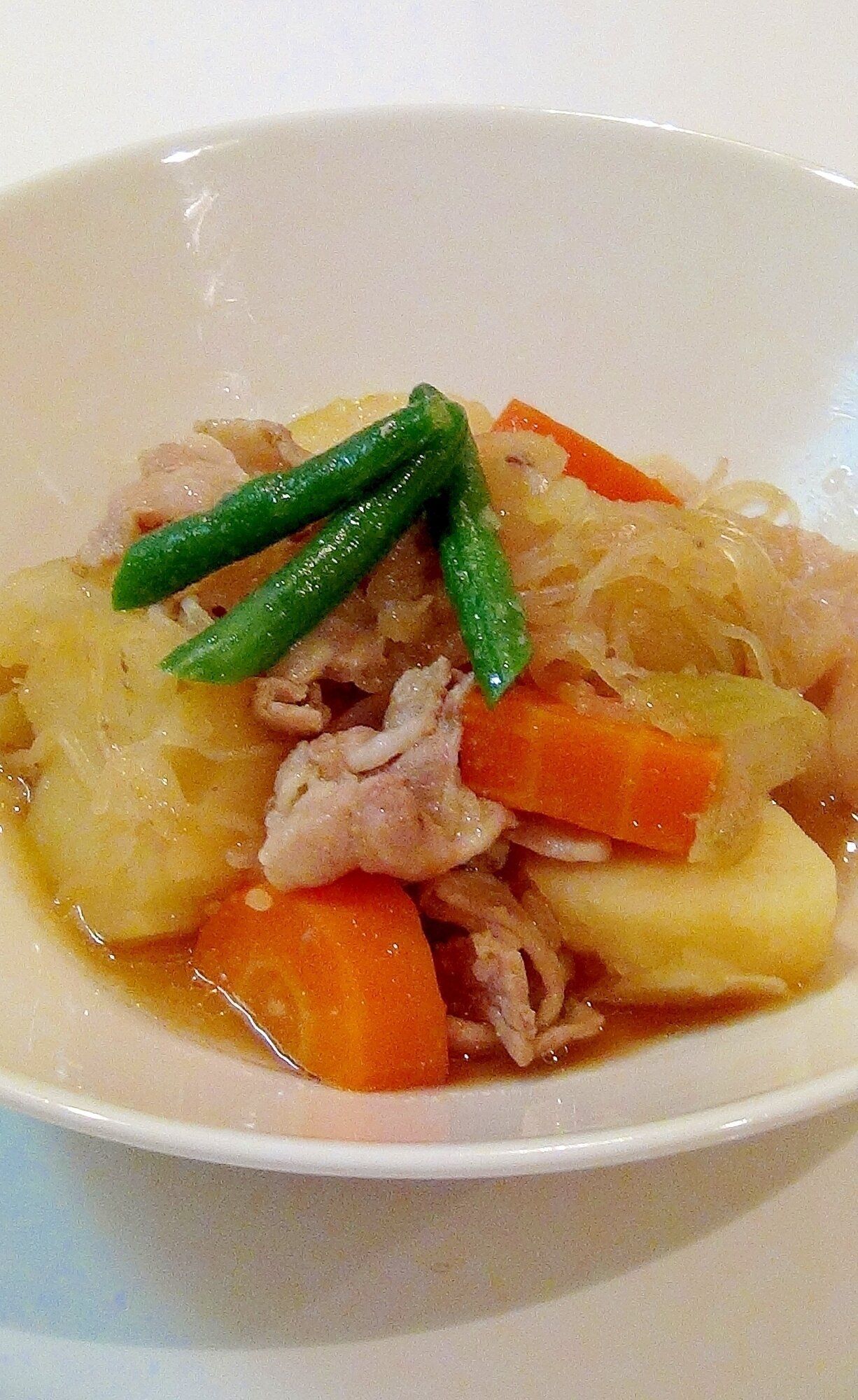 圧力鍋を使った、時短肉じゃが。しらたきと野菜がたっぷりと入っているので、ヘルシーで食べ応えもあります。盛りつけるときにインゲンを添えると、色味のバランスもアップ!