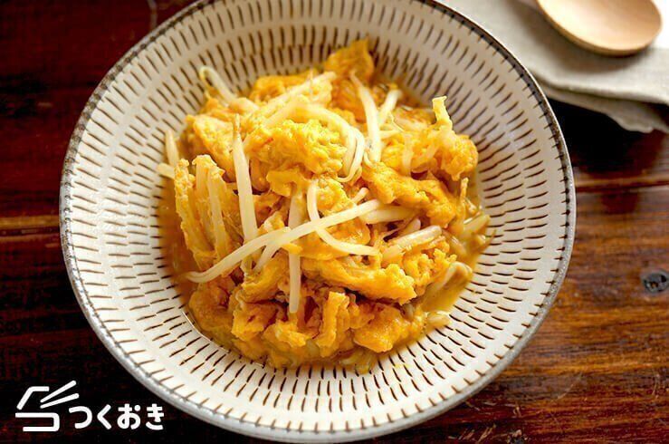 子どもから大人まで大好きな、鶏肉と玉ねぎの卵とじ。甘みのある和風だしを吸った卵がふわふわで絶品です。濃いめの味つけになっているので親子丼にしたり、ご飯と一緒に食べるのにぴったり。つくり置きしておけば、いそがしい日に重宝しますよ。