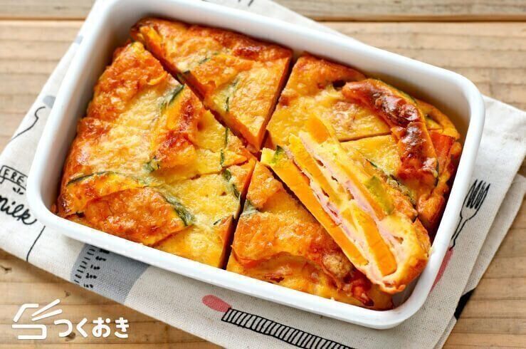 きれいな見た目とサクッとした食感が楽しめる、キッシュ風レシピ。白だしと相性のいいベーコンやかぼちゃを重ねていて、食べごたえ抜群です。かぼちゃに火が通りやすくなるように、皮の厚みがあるところをむいておきましょう。