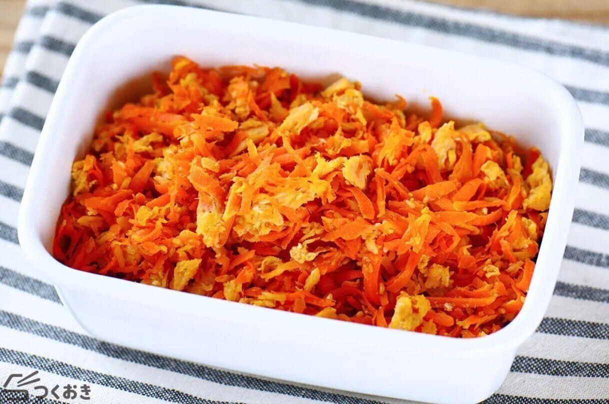 味つけはシンプルな白だしのみで、さっぱりと食べられる一品です。冷やすと味が馴染んでおいしくなるため、暑い時期の副菜としてもおすすめ。ニンジンは皮つきを使うことで、栄養価が高くなり色鮮やかに仕上がります。