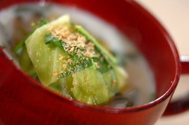 キャベツとニラを使った中華風スープレシピ。白だしベースのスープに牛乳をプラスしていて、野菜とよく合います。すりごまを散らして仕上げれば、香りや食感がよりアップしますよ。