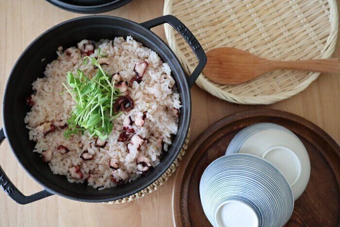 タコから溶け出しただしと、いっしょに入れた白だしが相まって、うま味たっぷりの炊き込みごはんに。さらにごま油としょうがの香りが、口いっぱいに広がります。しょうがは皮つきのまま使うと◎。