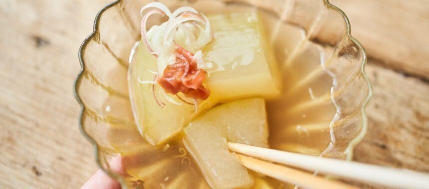 とろとろに仕上げる冬瓜の煮物。お出汁との相性抜群でやさしい味付けです。しっかり冷やして食べるのがポイント。
