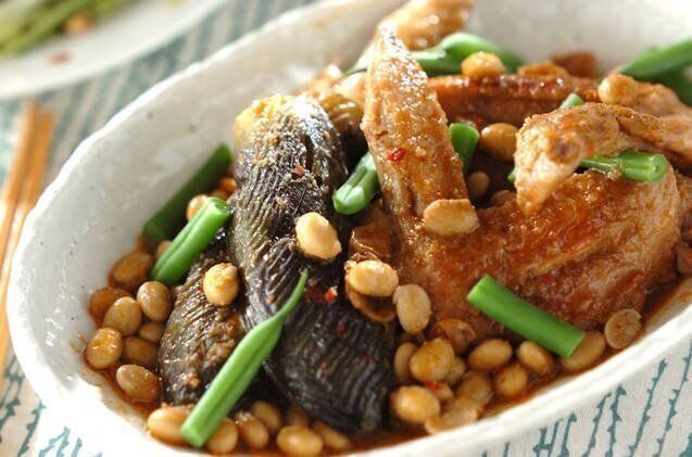 手羽先にしっかりとだしがしみ込んだ、ボリューム満点の煮物レシピ。水煮大豆やナスが入っていて、食感の違いも楽しめる一品です。豆板醤を混ぜることで、味にアクセントが加わりますよ。