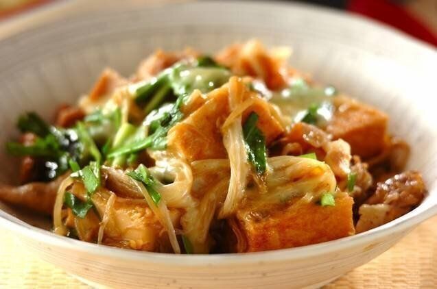厚揚げと豚肉を使った甘辛い煮物に、とろりと溶けたチーズがマッチした絶品レシピです。ニラは最後にサッと混ぜるだけにして、歯ごたえを残しましょう。コチュジャンで辛味をプラスしたアレンジもおすすめ。