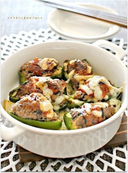 ひじき煮とおから入りピーマンの肉詰めチーズ焼き