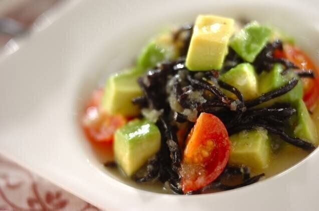 ひじきにアボカドやトマトを組み合わせた、おしゃれなサラダレシピです。鮮やかな見た目なので、おもてなし料理としても活躍しますよ。すりおろした玉ねぎのマリネ液ともよくマッチします。