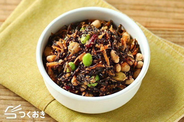 ひじきと豆の五目煮は、一度に5品目とれるヘルシーな一品です。干ししいたけや人参、油揚げの旨味が染み込んだひじきは、やみつきになる味わい。冷たいままでも温めてもおいしいので、常備菜に最適です。