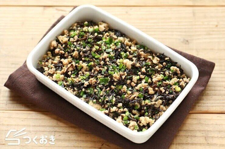 ひじきの風味がアクセントになっている、鶏そぼろのレシピ。素朴な味わいで常備菜としてもおすすめです。豆腐を加えたり、丼ものにしたりしても◎。冷めてもおいしいので、お弁当のおかずにも最適です。
