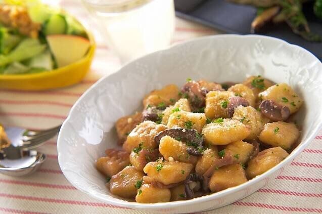 ジャガイモのニョッキに、香り豊かなマッシュルームソースを和えた一品です。マッシュルーム以外にも、お好みのきのこをプラスして楽しめ、きのこの旨味をしっかり感じられます。