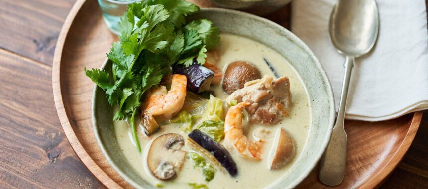 グリーンカレーのペーストをいっしょに炒め合わせることで、香りまでおいしい仕上がりに。たっぷり入れたマッシュルームやキャベツの甘さが染み出るので、カレーの風味を引き立たせてくれます。