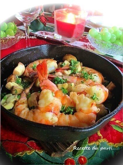 にんにくとオリーブオイルで3分ほど煮込んだアヒージョ。スキレットで食卓にそのまま出せば、かわいらしい見た目も楽しめます。具材のだしが出たニンニクオイルは、バゲットにつけて食べてもおすすめです。