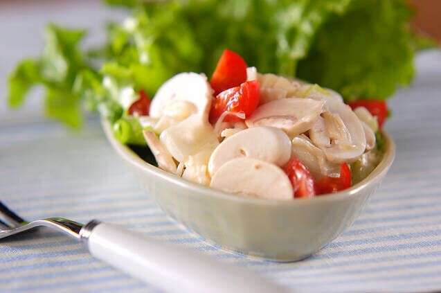 マッシュルームとセロリを使った、歯応えがたのしいサラダのレシピです。彩りも美しく、ホタテ缶をプラスして旨味をアップさせているので、サラダが苦手な人でもおいしくいただけます。