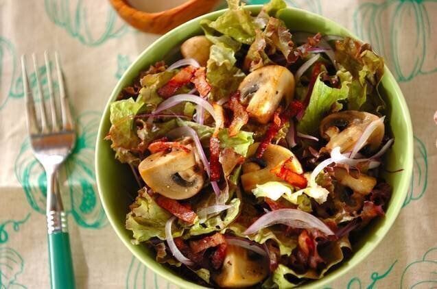 マッシュルームとベーコンを大きめにカットすれば、2つの食感を生かせるシーザーサラダに仕上がります。紫玉ねぎのほどよい辛みがクセになる一品。マンネリ化して飽きやすいサラダをアップデートできます。