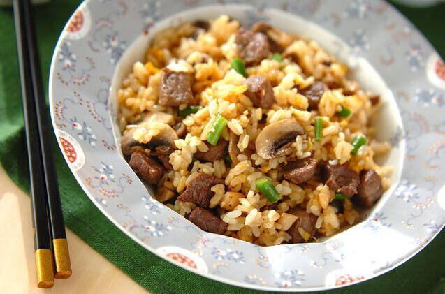 食べ応えのありそうな、牛肉とマッシュルームのチャーハン。具材を大きめにカットしてボリューム感をプラスしたり、コショウを多めに入れて、パンチのある味わいに仕上げるのもよいですね。