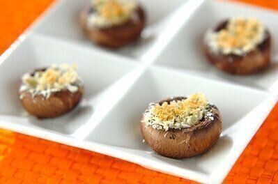 マッシュルームにチーズを混ぜたパン粉を乗せてトースターで焼くだけの簡単レシピ。粉チーズの香ばしさと、マッシュルームの旨味の相性抜群です。
