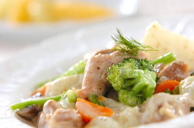 生クリームが溶け込んだ、まろやかな味つけの煮込みレシピ。野菜をハンドミキサーにかければ、小さい子どもでも食べやすくなります。マッシュルームはオリーブオイルで炒めてから加えると◎。