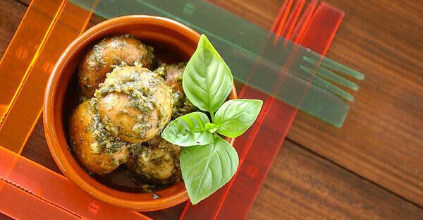 ブラウンマッシュルームを使った、ワインのお供にもぴったりな一品です。マッシュルームをにんにくやバターでソテーし、仕上げにジェノベーゼソースに和えるだけの、誰でも手軽につくれる簡単レシピです。