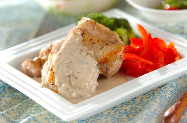 ペースト状にしたマッシュルームを使ってつくる、マッシュルームソースチキンソテー。こんがり焼いたチキンと、マッシュルームソースの組み合わせを楽しめます。野菜も添えて、彩り豊かにいただきます!