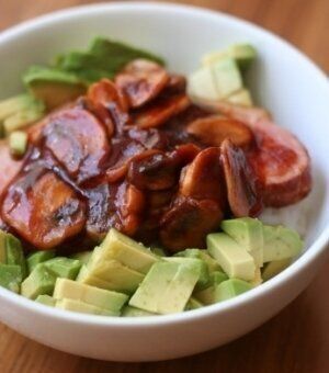 アボカドとハムのボリュームたっぷり、ハムステーキどんぶりです。マッシュルームは大きめのものをスライスして使います。簡単につくれて、お昼ご飯にぴったりなどんぶりレシピです。