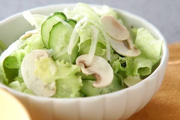 「マッシュルームのサラダ」は、マッシュルームを生で食べることができるサラダ。レタスやキュウリ、トマトにドレッシングをかけていただきます。生のマッシュルームと野菜の組み合わせでよりおいしさが引き立つレシピです。
