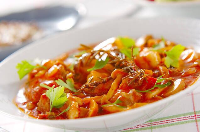 カチャトーラは、「漁師風の料理」という意味のイタリア料理です。鶏もも肉や豚バラ肉のほかに、マッシュルームやエリンギ、シメジなどのきのこ類もたっぷり入っており、食べ応えもある一品です。