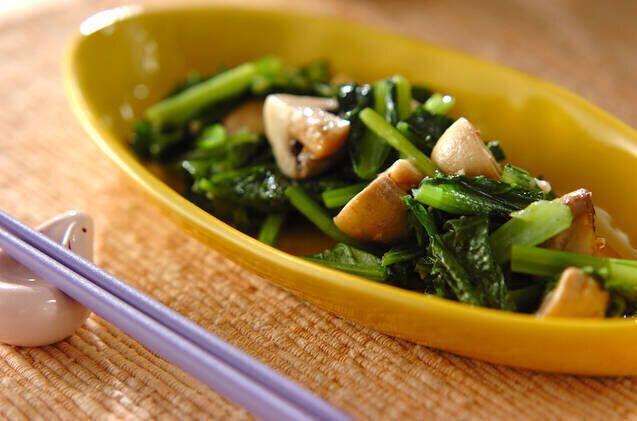 小松菜やマッシュルーム、にんにくの香りも効いた、炒め物のレシピです。約15分で完成する手軽さもポイントで、和食の副菜や、おつまみにもぴったりの一品です。