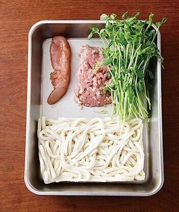 冷凍うどん、明太子、ひき肉、豆苗は、最強スピードべんとうの4食材。豆苗ははさみで切ればいいから包丁いらず!