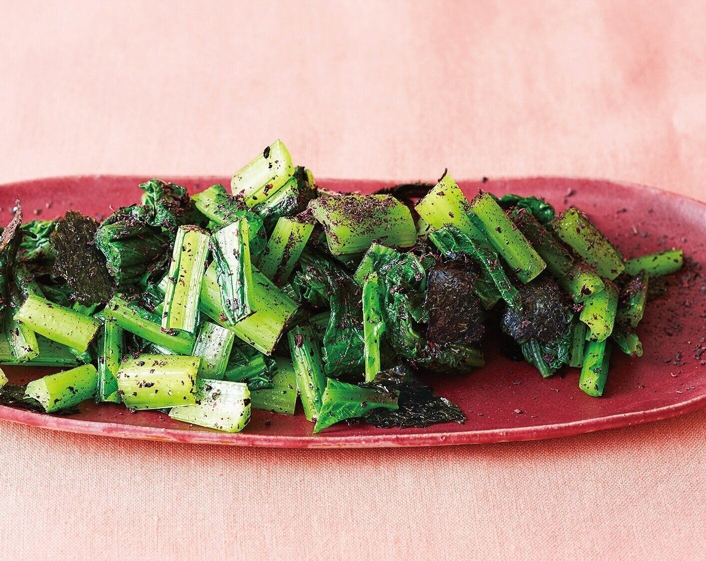 小松菜は塩少々を加えた湯で約1分ゆでて冷水にとり、水けをきって長さ3cmに切る。ゆかり小さじ1 1/2、ごま油を加えて混ぜ、ちぎった焼きのりを加えてあえる。器に盛り、ゆかり少々をふる。