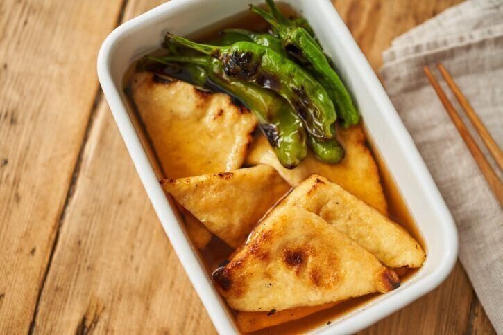 グリルしたおあげとししとうにお出汁の味がしみている優しいお味の一品。グリルで焼くと香ばしさが増して絶品です。