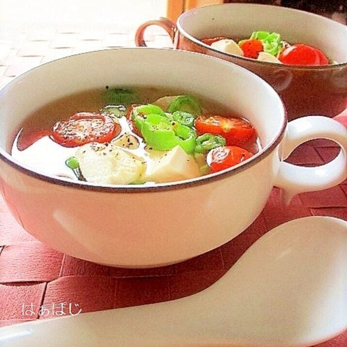 ミニトマト、豆腐とししとうを合わせることで、鮮やかな色どりも楽しめる洋風スープです。こしょうはお好みで粗びきのものを使うと、香りと辛味のアクセントを加えることができます。