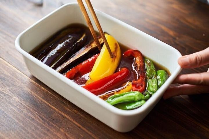 ナス、かぼちゃ、ししとうの色の組み合わせが華やかな、野菜の揚げびたし。和食のメインにもってこいですよ。夏場は特に、冷蔵庫で冷やして食べてみてはいかがでしょう。
