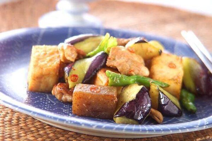 ナスや厚揚げなど、ごろごろ入った具材を楽しめるみそチャンプルー。みそのコクのある味付けに、ししとうの風味がアクセントになりそうですね。辛みはお好みで調整してください。