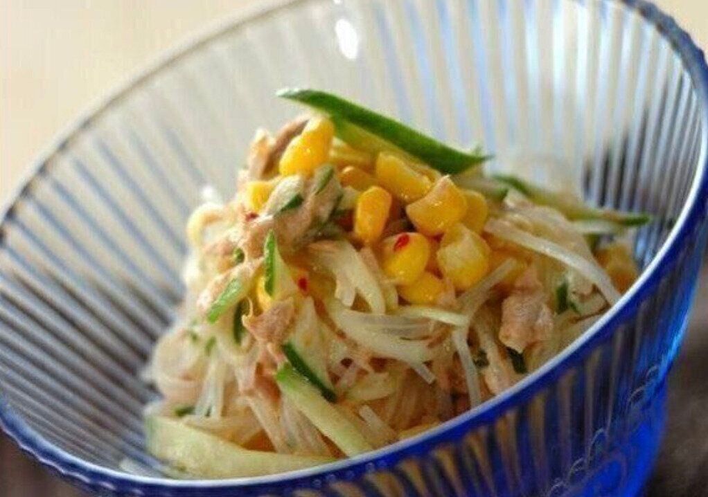 ツナとコーンも加えた、色鮮やかな春雨のピリ辛ゴマ酢サラダのレシピ。うま味たっぷりのツナがつるつる食感の春雨とからんで、箸が進みます。さっぱりした味わいと、ラー油のピリ辛さがクセになりそう!