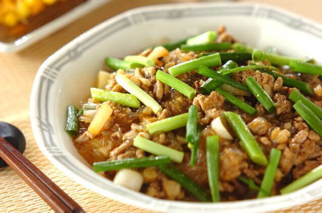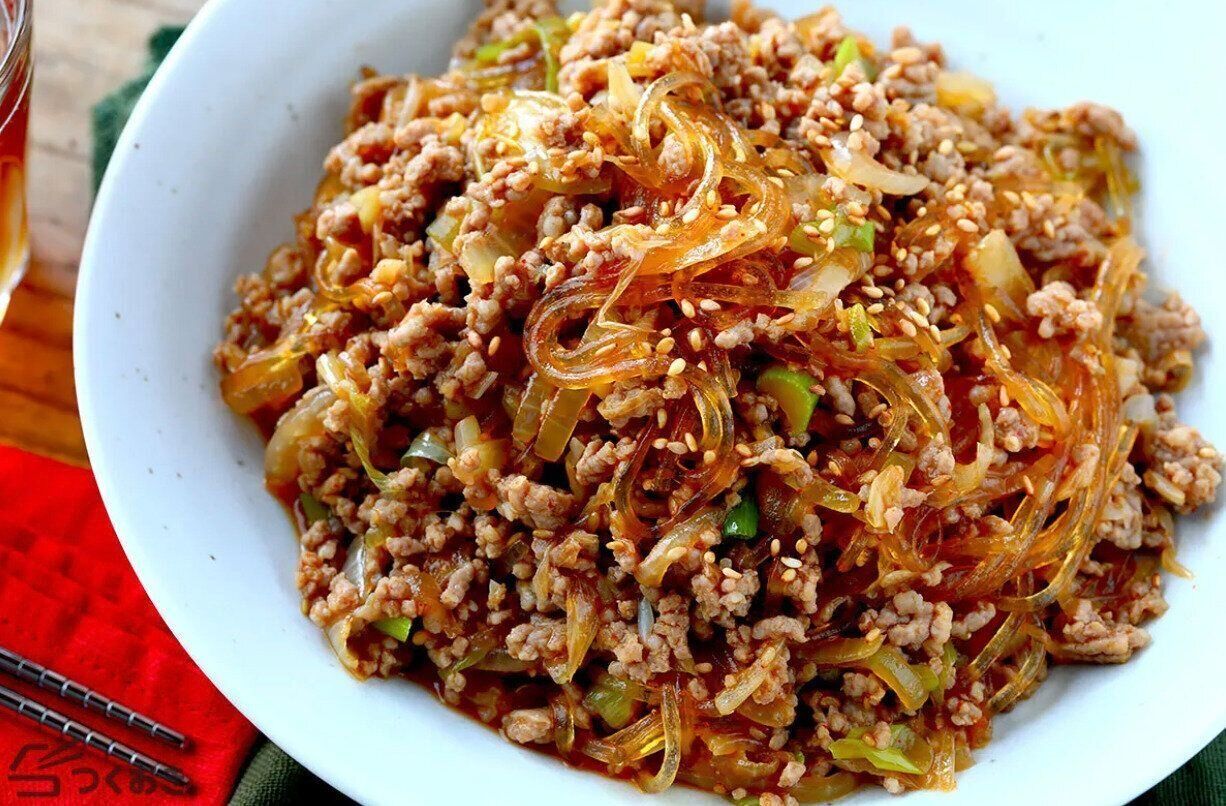 野菜をたっぷりとれる、和風チャプチェのレシピ。春雨が豚ひき肉、野菜のうま味を吸ってやみつきになる味わいです。しっかりめの味つけなので、ご飯が進むこと間違いなし!大人も子ども楽しめるコクうまおかずです。